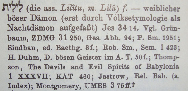 Nach der Demonolatry-Liste: in der hebräischen Mythen die erste Frau Adams, später die Gattin des Satan, Prinzessin der Hölle. Nach mehreren Dämonologen regiert sie über die Succubi. Es wird behauptet, sie versucht die neugeborenen Kinder zu zerstören. Aus diesem Grund schrieb man eine Formel zur Fernhaltung der Lilith an alle 4 Ecken der jüdischen Geburtszimmer.