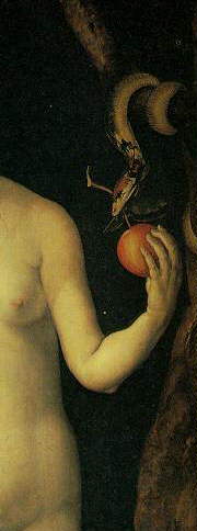 Das genannte Bild einer anatomischen Missgeburt (Verzeihung, Missschöpfung *g*) kratze ich an und finde es als die Schminke einer mittelalterlichen Kirche, die aus geläufigen Komponenten antiker Gottheiten (z.B. Pan) eine Figur christlicher Mythologie zu verzerren trachtete. Aber auch das Bild der christlichen Mythologie will ich nicht heil lassen und kratze und zerstöre und will sehen, was darunter ist. Um mir die vielen Zwischenbilder zu ersparen, bediene ich mich gleich des möglichst ursprünglichsten Bildes der Christenheit, dem aus der Bibel.