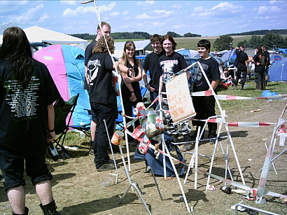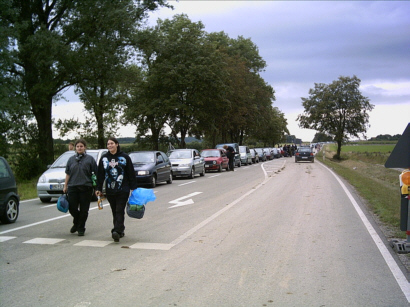 Sämtliche Autos wurden nämlich strengstens nach Waffen und sonstwas durchsucht, außerdem sollen von den 5 Zufahrten 4 nur Feldwege gewesen sein, die durch den Regen vom Vortag unbefahrbar geworden waren, so dass nun alle Autos auf 1 Zufahrt entlang krochen. Ja gut, so lief ich halt zu Fuß auf den Campingplatz und begann, mein Zelt aufzubauen. Ich glaub, als ich fertig war und schon zum Gelände runter lief, standen Maria und Jens immer noch im Stau...