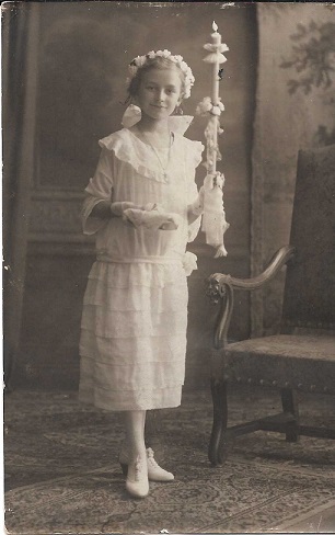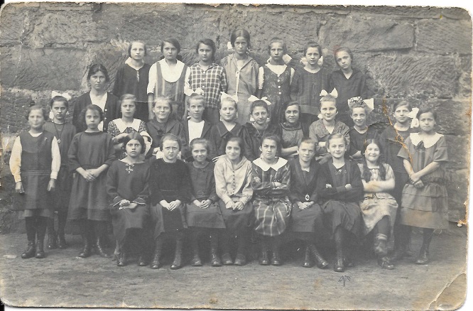 Hier seht ihr Luise, meine Oma, noch als Kind in der Schule auf einem Klassenfoto. Sie ist das Mädchen mit der weißen Schürze in der Mitte, vor dem Lehrer.