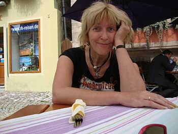 Eigentlich freute ich mich ja schon seit vorgestern auf Dinkelsbühl, weil ich weiß, hier gibt es ein McDonald's! Nix mehr Pflaumen und Maiskolben, jetzt gibt's einen Big Mac! Aber als ich dann an dieser Pizzeria vorbei lief, sprang mich die Pizza regelrecht an, also hockte ich mich rein und bestellte mir ein Radler und eine Pizza. Lecker!