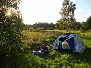 Auf der halben Abfahrt nach unten kam ich dann endlich wieder ein Stück aus dem Wald raus und an einer Kfz-Garage vorbei. Hinter der Werkstatt war eine Wiese und da baute ich dann mit letzter Kraft mein Zelt auf. Ich war so alle, dass ich es nicht einmal mehr schaffte, den PC auszupacken und zu bloggen. Mit Ach und Krach schrieb ich per Hand noch mein Tagebuch in das Heft, das ich mir in Bechhofen dafür gekauft hatte und dann krachte ich nur noch weg.