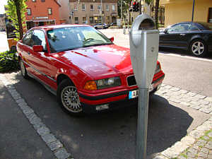 Das ist nicht nur ein schönes, rotes Auto, das ist eine völlig antiquierte Parkuhr, wo man noch richtig ein Fuchzgerla reinschmeißen muss und dann dran drehen muss, um die Uhr aufzuziehen! Sowas gibt's in Aalen noch!