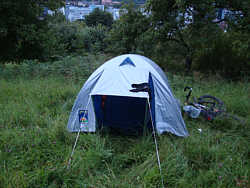 Endlich hatte ich ein Maisfeld gefunden und eine Wiese, aber als ich mein Zelt drauf aufschlagen wollte, stellte ich fest, dass die Tage hier eine Schafherde geweidet worden war, die jetzt mitsamt Schäfer und Hunden 3 Wiesen weiter stand, und alles lag voller Schafscheiße! Also weiter.