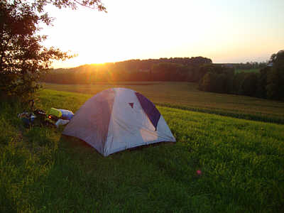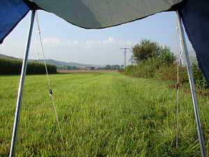 Ich radelte noch eine Weile durch einen Wald und war dann schon recht nah an Ravensburg. Wenn ich erst mal in Citynähe war, war's aus mit günstigen Zeltplätzen, also ging ich gleich auf die Suche und fand diese schöne Wiese hinter einem Maisfeld, wo ich neben einem Baum mein Zelt aufschlug.