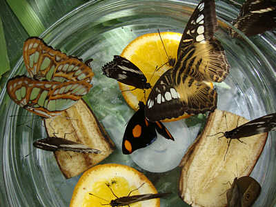 Zu dem Zweck haben sie überall so Früchteschälchen aufgestellt mit Orangen und gammligen Bananen und da hocken dann die Schmetterlinge drauf und lassen sich endlich mal fotografieren. Leider machen sie dabei selten die Flügel auf und man sieht kaum, was für tolle, bunte Flügel sie haben.