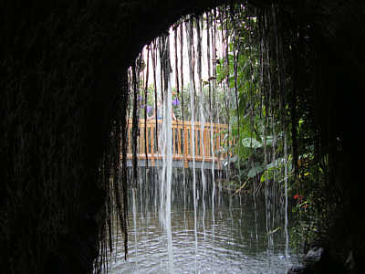 Ein "Schmetterlingshaus" ist auch auf der Insel. Da kommt man durch Glastüren und einen Holzvorhang in eine Glashalle mit tropischem Klima und Unmengen an riesigen Schmetterlingen, die da frei rumflattern. Leider sind die Viecher so schnell und unstet, dass man sie mit dem Foto fast nicht erwischt. Kaum hockt mal einer auf seinem Hintern, flattert er auch schon wieder fort.