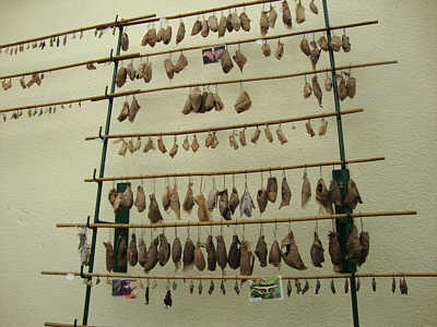 An der Wand sind die Schmetterlings-Puppen aufgehängt. Die Raupen verkrümeln sich offensichtlich in Blätter. Ich weiß nicht, ob das noch lebendige Puppen sind oder nur abgestorbene Ausstellungsstücke?