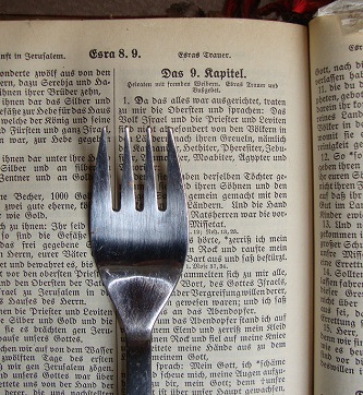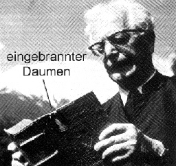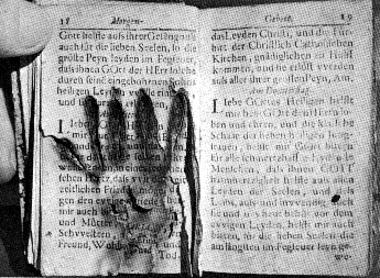 Oben links sieht man auf diesem Foto noch den "großen" Daumen, der das recht kleine Gebetsbuch hält. Trotzdem wird der Abdruck darin für eine Hand gehalten! Es wird wohl die Hand eines Dämonen-Kindes gewesen sein, was? War halt noch ein Baby...